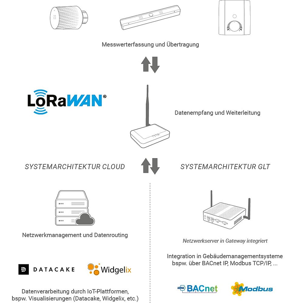 Neben der klassischen Integration von Sensoren in die Regelung von bspw. Lüftungsanlagen und in die Gebäudeautomatisierung bietet die LoRaWAN®-Schnittstelle die Möglichkeit, Livedaten unabhängig von der Gebäudeautomatisierung in eine Cloud zu senden, bspw. als Datengrundlage für vorbeugende Wartung.