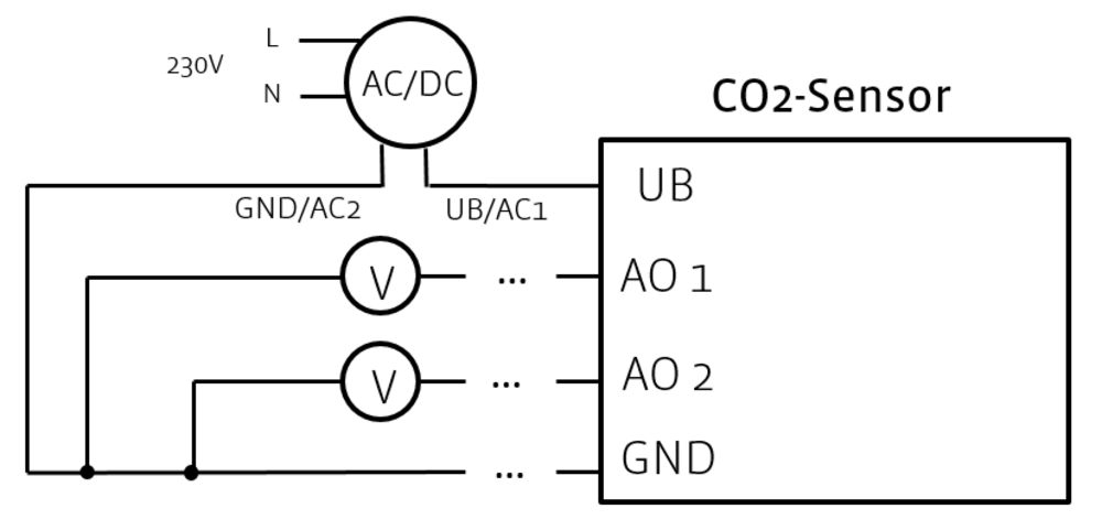 Werden die analogen Ausgänge des CO2 Sensors über die gleiche GND Leitung wie die Spannungsversorgung angeschlossen, kommt es zu Abweichungen. Dies ist dem unvermeidbaren Spannungsabfall entlang der GND-Leitung geschuldet. Die Höhe der Abweichung hängt auch hier von der Länge, dem Querschnitt und der Betriebstemperatur der Anschlussleitung ab.
