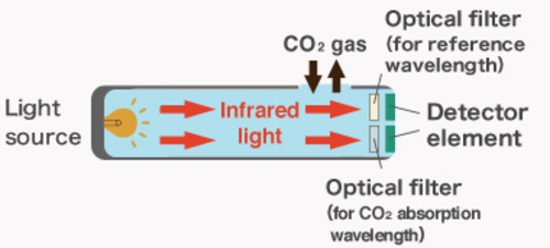 CO2 Sensoren detektieren das Gas mit Hilfe von infraroter Strahlung. Eine bestimmte Wellenlänge dieser Strahlung wird von CO2 Molekülen absorbiert. Diese Absorption wird detektiert und daraus der CO2-Gehalt der Luft errechnet.