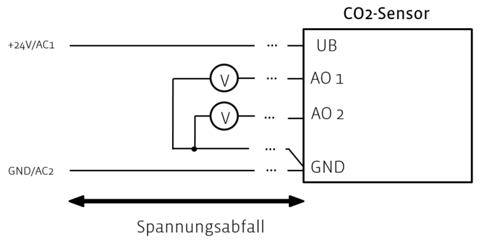 Der Spannungsabfall entlang der UB-Leitung ist so groß, dass der CO2 Sensor gerade noch innerhalb der Toleranzgrenze betrieben wird.