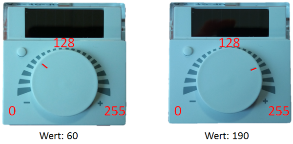 Er wird als relativer Zahlenwert von 0..255 (1-Byte Wert) übertragen. Dieser Wert gibt z.B. die Winkelposition des Drehpotis an: