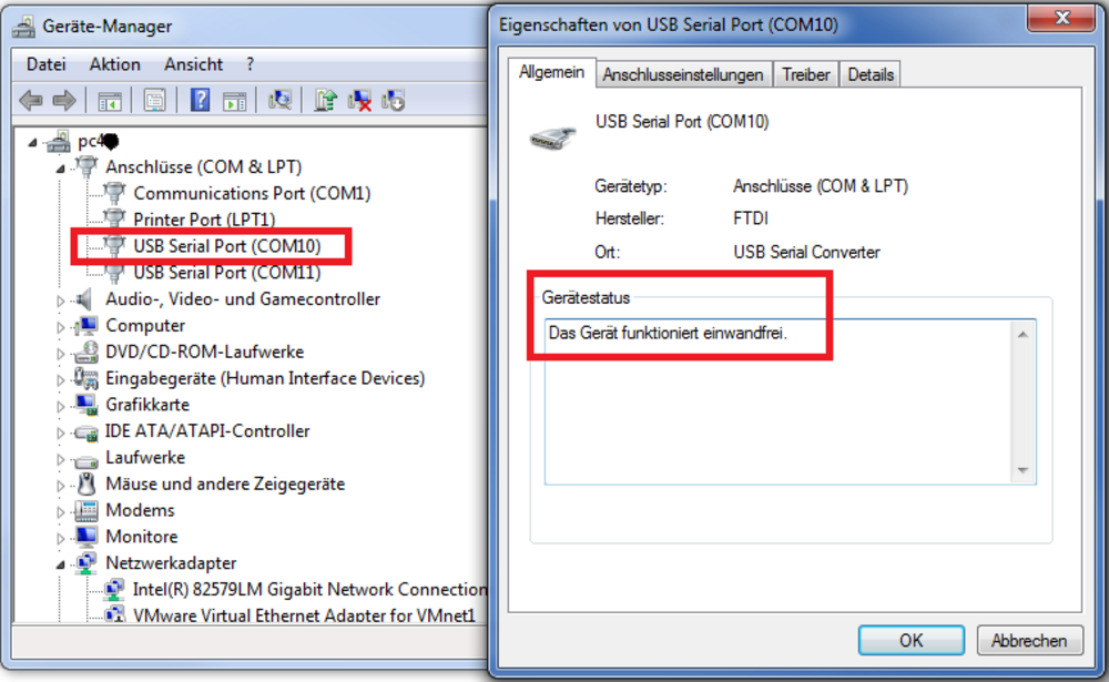 Sollte dies nicht der Fall sein, überprüfen Sie bitte in der Geräteverwaltung, ob der USB-Transceiver ordnungsgemäß als serielle Schnittstelle eingerichtet wurde. Stellen Sie sicher, dass Sie alle nötigen Zugriffsrechte auf die Schnittstelle (Administratorrechte) besitzen.