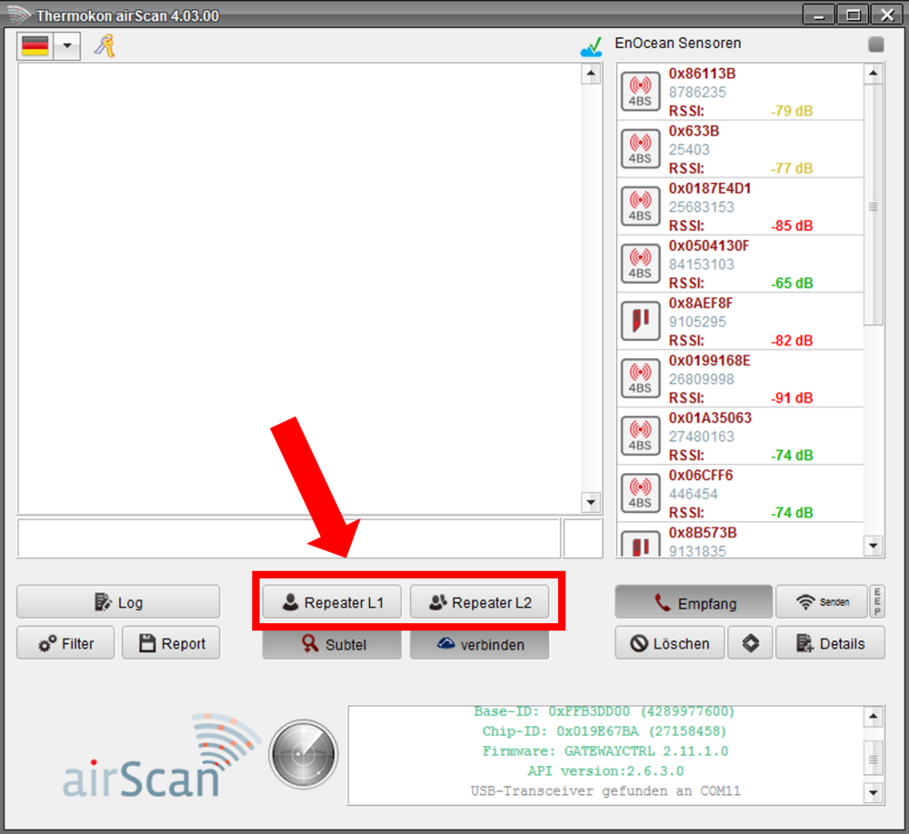 Mit Hilfe des Softwaretools airScan lässt sich die richtige Position für einen Repeater ermitteln. Sollte die Funkreichweite einer Anwendung nicht ausreichen, platzieren Sie den EnOcean USB Tansceiver in etwa mittig zwischen Sender und Empfänger. In airScan können Sie nun den gewünschten Repeater (Level 1 oder Level 2) aktivieren.