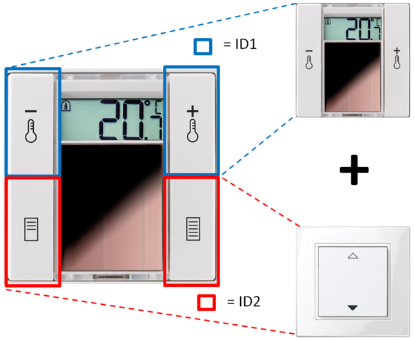 Das SR06 LCD 2T Blind und 2T Light kombiniert zwei Geräte und besitzt daher zwei EnOcean Sende-IDs. Es besteht aus einem SR06 LCD 2T und einem EnOcean-Funktaster.