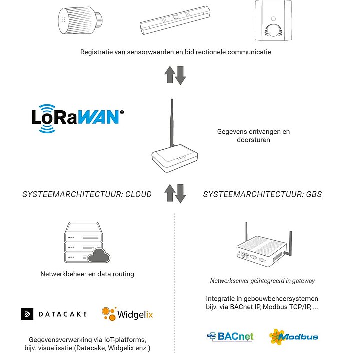 Een LoRaWAN®-netwerk bestaat doorgaans uit drie componenten: eind nodes – meestal sensoren in gebouwautomatisering –, gateways voor het ontvangen en verzenden van opgenomen metingen, en een netwerkserver die wordt gevoed met de gegevens voor verdere verwerking en visualisatie: