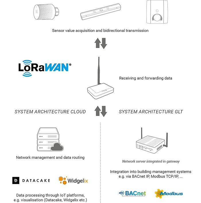 In Retrofit- aber auch Neubauprojekten im Bereich der Gebäudeautomation setzen sich immer mehr Lösungen auf Basis des LoRaWAN® Funkstandards durch. Die Funkanbindung von Sensoren, Zählern oder Bediengeräten über LoRaWAN® bietet dabei einige Vorteile gegenüber anderen kabellosen Technologien. Neben der klassischen Integration von Sensoren in die Regelung von bspw. Luftbehandlungsgeräten und in die Gebäudeautomatisierung bietet die LoRaWAN®-Schnittstelle die Möglichkeit, Livedaten unabhängig von der Gebäudeautomatisierung in eine Cloud zu senden, bspw. als Datengrundlage für vorbeugende Wartung.