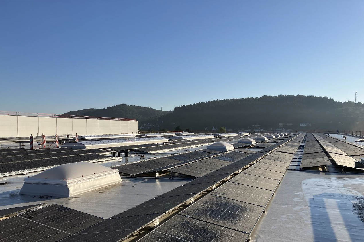 Wir nutzen großflächige Solaranlagen auf den Dächern unserer Firmengebäude, um sauberen Strom zu produzieren und so den eigenen CO₂-Fußabdruck zu reduzieren.