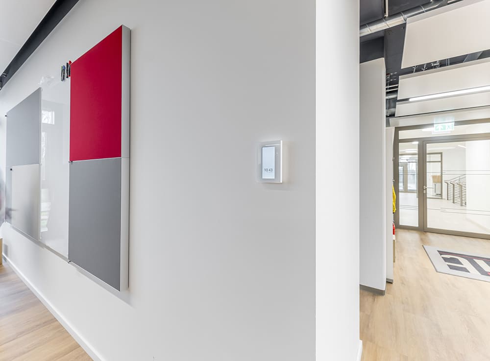 Insgesamt kamen im NEXTEC-Campus 150 Raumbediengeräte vom Typ thanos EVO, kombiniert mit rund 100 Kanaltemperatursensoren sowie diversen weiteren Sensorik-Komponenten, zum Einsatz. Neben der Lichtsteuerung werden über die leistungsstarke Lösung des Sensorik-Experten auch die Heizung sowie die Jalousien angesteuert.