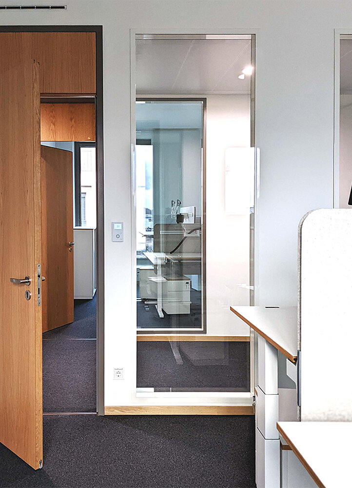 Die Ausstattung der Büros und Besprechungsräume in den beiden Häusern erfolgte schließlich mit insgesamt 406 JOY-Raumbediengeräten. Die für einen Teil der Räume ebenfalls gewünschte Fensterüberwachung wurde mit einer Kombination aus rund 70 EasySens® Funk-Fensterkontakten und EnOcean- / Modbus-Gateways (ebenfalls Produkte von Thermokon) realisiert. Für repräsentative Räume mit hochwertiger Designeinrichtung fiel die Wahl hingegen auf thanos EVO. Dort strebten die Verantwortlichen an, durch die Premium-Lösung von Thermokon mit ihrem hochauflösendem 4,8-Zoll-Touch-Display für ein edles Finish zu sorgen. Unter Einbindung der Wetterprognosen in die MSR-Regelung sollte zudem in sämtlichen Räumen die Steuerung von Licht und Außenjalousien sowie die Regelung der Lüftungsanlagen sichergestellt werden.