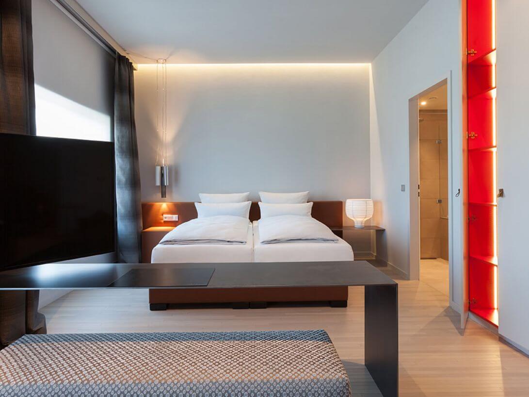 Für Wohlfühlambiente in den Hotelzimmern ist dabei gesorgt. Jedes der 129 Zimmer ist mit einer leistungsstarken Regelung zur bedarfsgerechten Steuerung von Lüftung und Klimaanlage ausgestattet. Hierzu setzt die Hotelleitung auf JOY Fancoil-Regler von Thermokon. Das ansprechende Design unterstreicht die wertige Zimmerausstattung und sein intuitives 4-Tasten-Bediensystem macht das Handling für ständig wechselnde Nutzer denkbar einfach. Über einen Keycard-Schalter können die Gäste bei Betreten des Zimmers den Comfort-Modus aktivieren und die Lüftung wunschgemäß steuern.